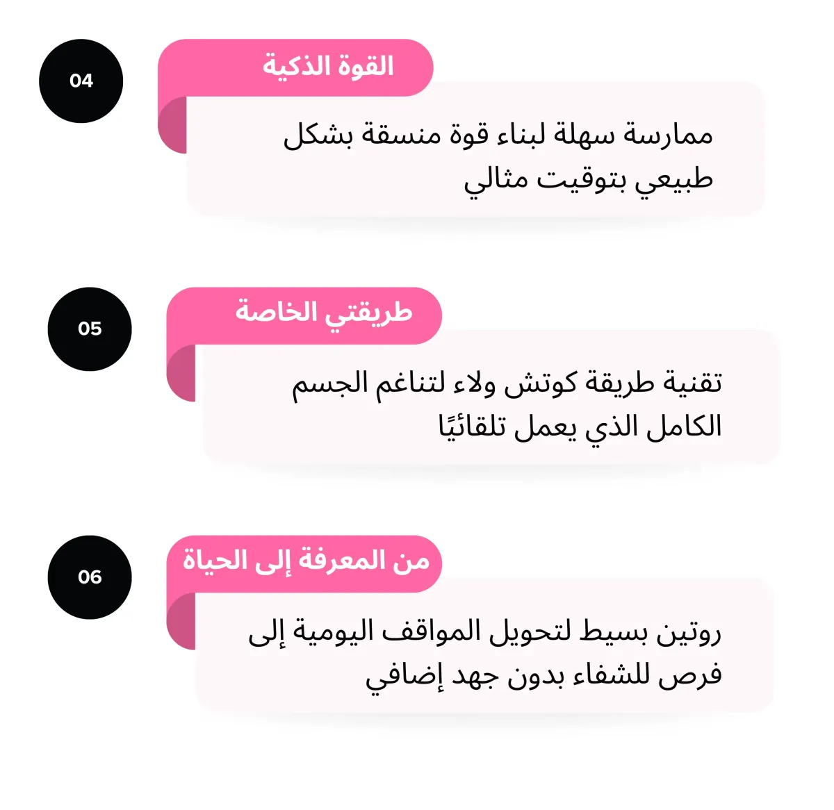 ستحصلين على دورة "استعيدي حوضك" التدريبية المتكاملة، متاحة الآن. تتضمن الدورة محتوى تعليمي عالي الجودة، وتمارين عملية، وإرشادات مفصلة لاستعادة صحة الحوض. ستحصلين أيضًا على مواد إضافية داعمة، ومجموعة من الأدوات المساعدة.